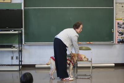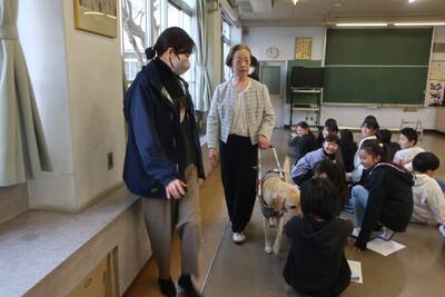 4年生 総合学習 「みんなにやさしいくらし」 ~視覚障害の方と盲導犬のお話~ 投稿: 情報担当 (16:10) カテゴリー: 学校行事 盲導犬について、実際に目に障がいがある方にお越しいただいて、お話ししていただきました。 盲導犬も実際に見て、お話を聞くことができました。盲導犬になるまでのことや視覚障がい者の 普段の生活についてお話していただき、とてもよい学習経験となりました。